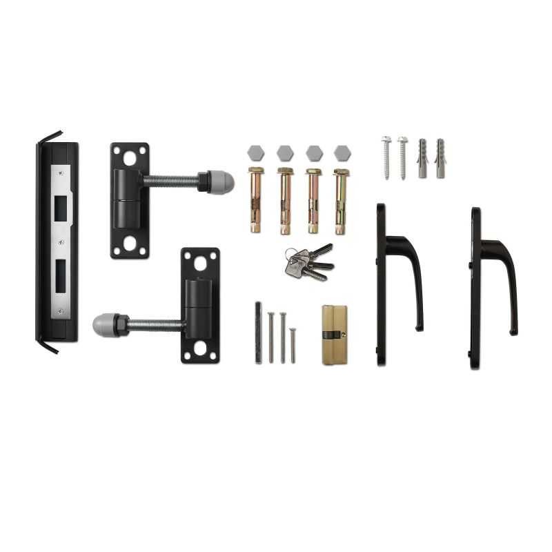 Accessoires : 2 poignées, 1 bloc serrure et 1 gâche, 3 clés, 1 barillet, fourni avec 2 gonds (ouverture 90° et 120°), visserie de fixation (pour gonds et serrure)